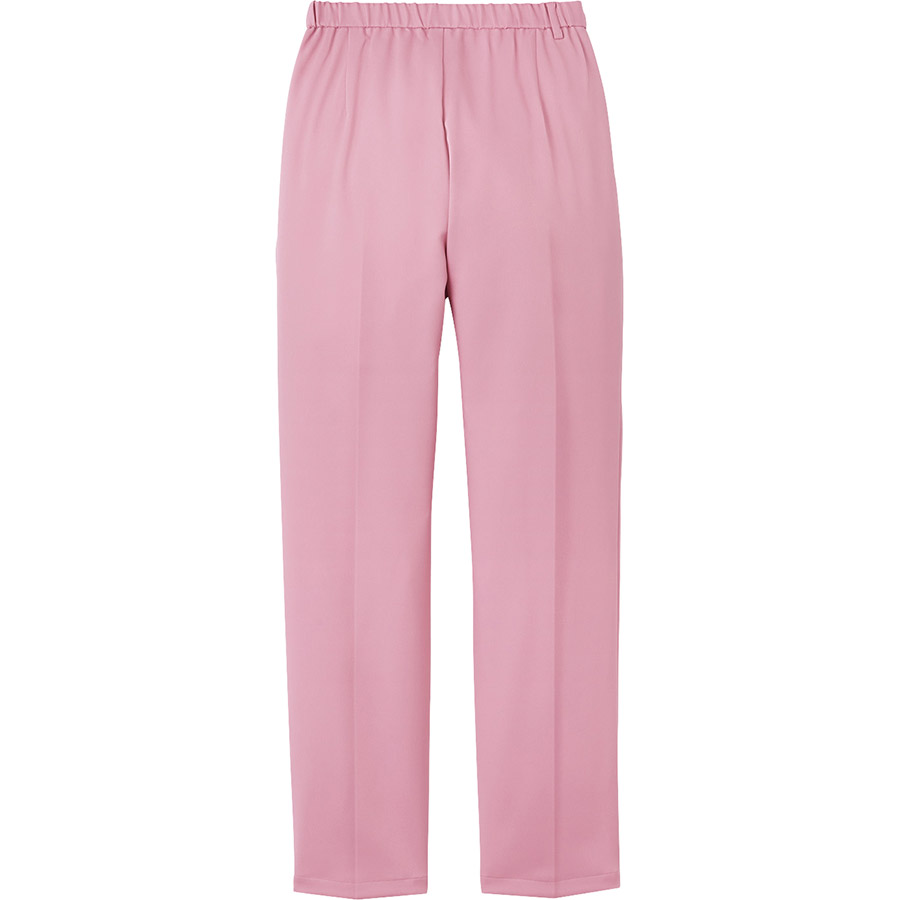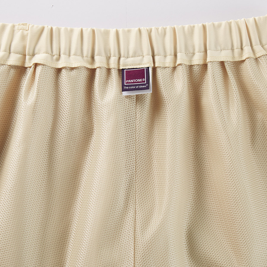 脇後ゴム、両腰ポケット、左右ベルトループ付、前ファスナー、裏地メッシュ、センタープレス