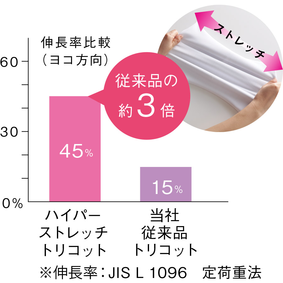 当社従来品のトリコットに比べ約3倍のストレッチ性を実現したワープニット。なめらかな風合いの軽やかな着心地です。