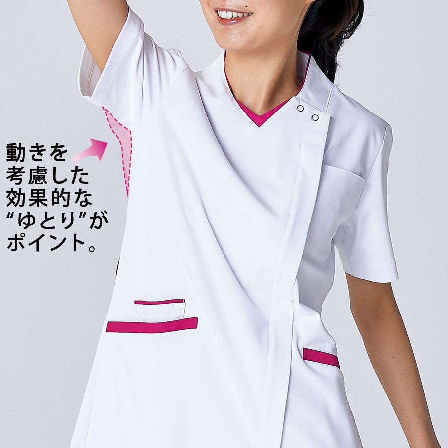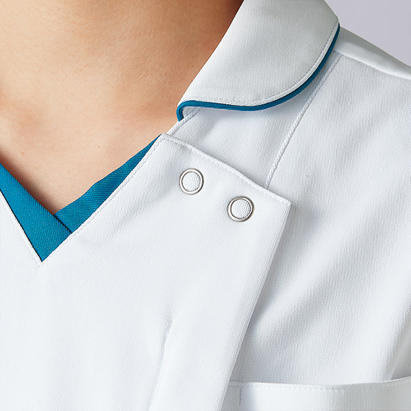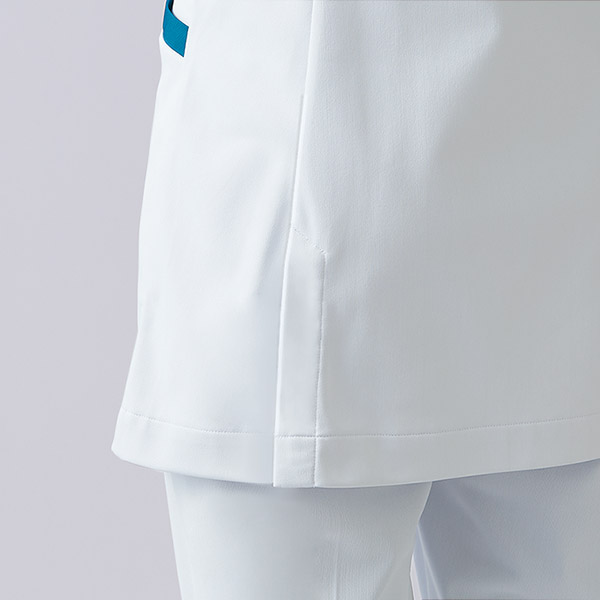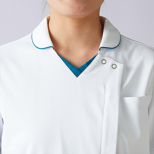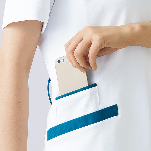 腕が動かしやすい高機能パターン設計とよく伸びるストレッチ素材をあわせて、ストレスフリーな着心地を叶えました。持ち物が取り出しやすく整理しやすいダブルポケット。軽く涼しい人気の生地です。シワになりにくいイージケア性も魅力です。制菌、吸汗速乾、制電、防汚といった機能付き。襟付きデザインはきちんと感をプラス。