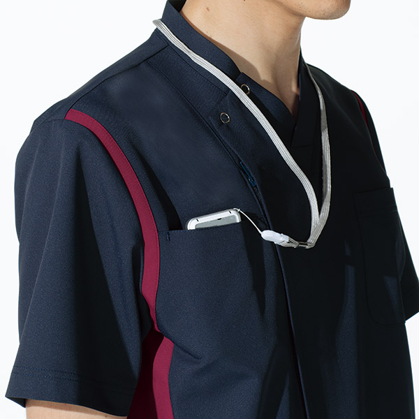 左胸ポケット、両腰ポケット(二重仕様)、右胸上部に携帯・PHSポケット付