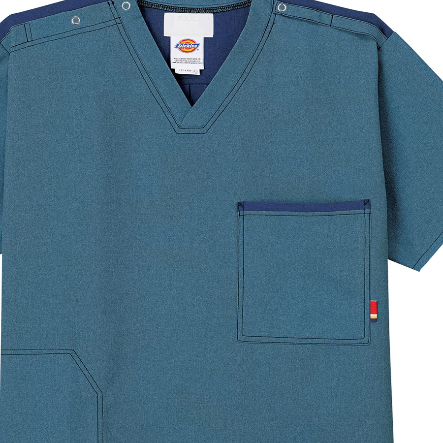 アメリカのワーカー達に圧倒的な支持を得ているワーカーズブランド「ディッキーズ」がいよいよ日本に上陸。フォークとのコラボレーションにより、日本の医療現場にふさわしいスクラブとなって初登場です。デニム調の生地を採用、ポケットや肩ループなど便利な機能も搭載