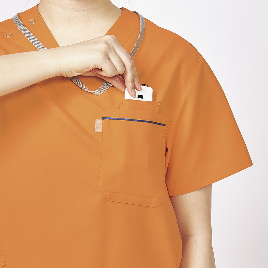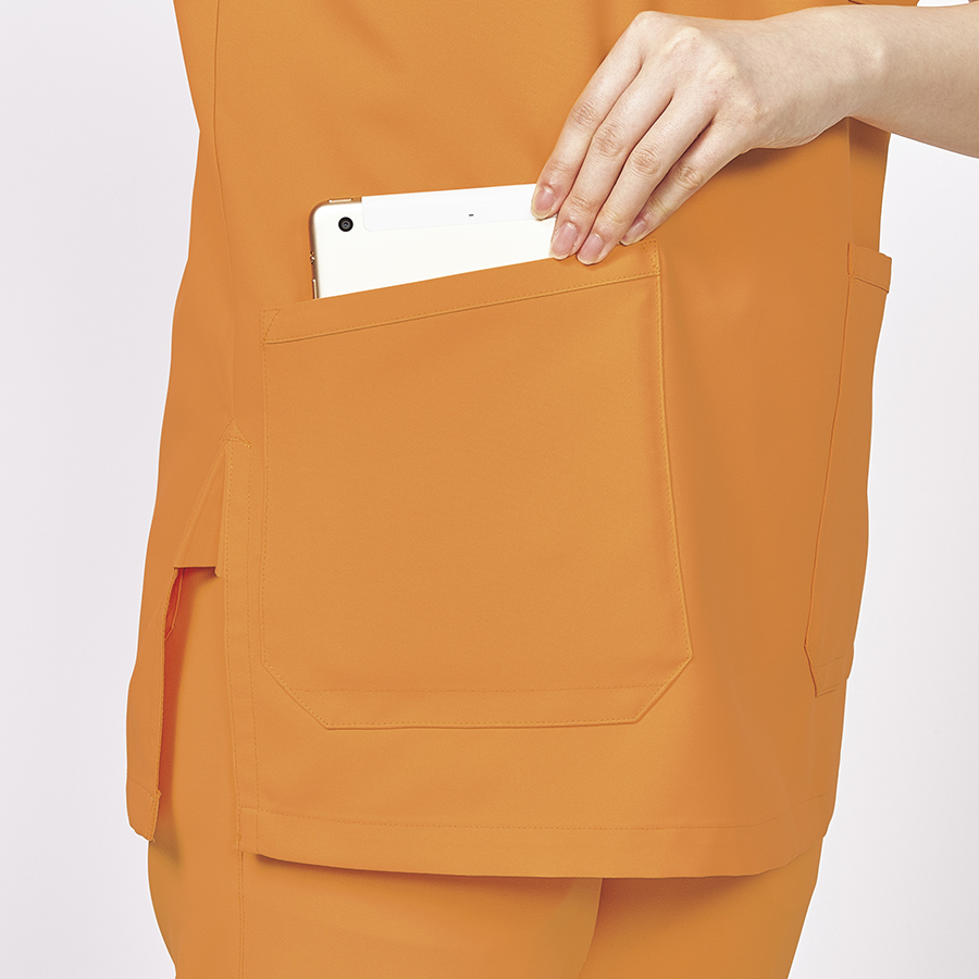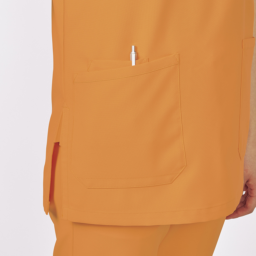 袖ぐりや胴回りによとりを持たせるなど体への負担やストレスが少ないデザインにしました。また、左胸ポケットはPHS専用ポケット付き、右脇ポケットはダブルポケット仕様など、医療現場に必要な様々な機能も充実させています。MZ-0018では通常のスクラブ(MZ-0021)に比べ、縫製へのこだわり(両脇スリットにマチを設け、縫製もテーピングにより補強)、ボールペンなどにより破れやインクのにじみを防ぐ為ポケット底に補強布をつける、胸ポケットにはおしゃれなパイピングを付ける等、ハイグレードな仕上がりとなっております。