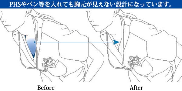 また、左胸ポケットはPHS専用ポケット付き、右脇ポケットはダブルポケット仕様など、
