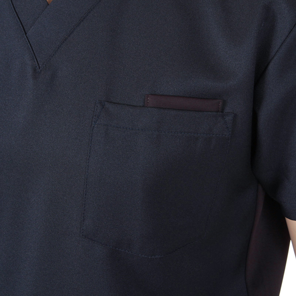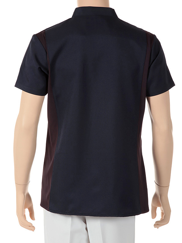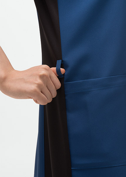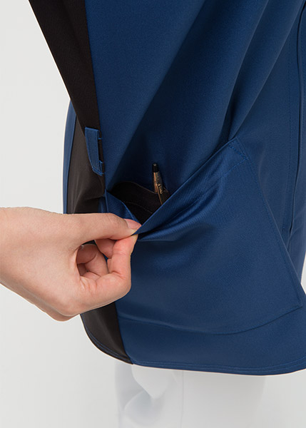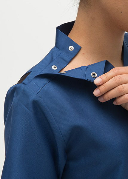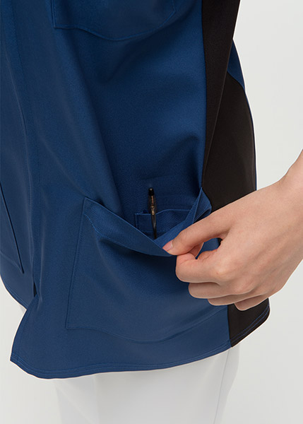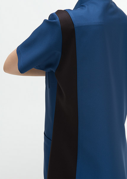 キャリアと知性を感じさせるスクラブデザイン。後ろ側がたつようにできた衿ぐりはPHSやネープレートのストラップが首につかないための配慮です。右衿元にドットボタンをつけて着脱の便利さと、胸元の明きを押さえています。▼▽▼ 商品の詳細情報はナガイレーベン公式サイトよりご覧いただけます ▼▽▼