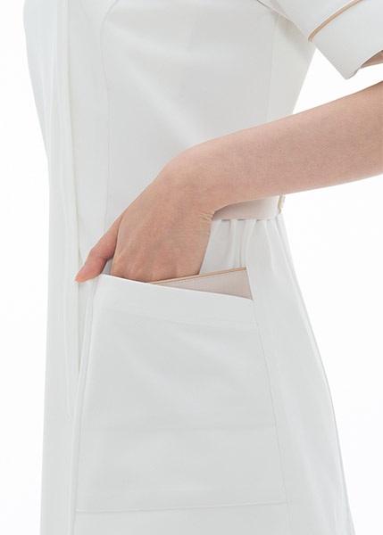 女性らしい衿元がやさしさを感じさせます。PHS用ポケットやキーループ、ダブルポケットなど機能面も充実しています。▼▽▼ 商品の詳細情報はナガイレーベン公式サイトよりご覧いただけます ▼▽▼