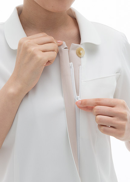 女性らしい衿元がやさしさを感じさせます。PHS用ポケットやキーループ、ダブルポケットなど機能面も充実しています。▼▽▼ 商品の詳細情報はナガイレーベン公式サイトよりご覧いただけます ▼▽▼