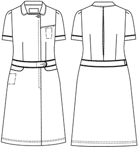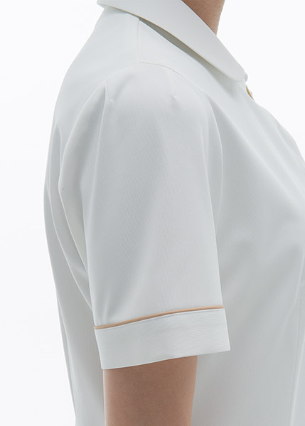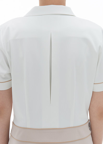 シンプルですっきりとした衿にエレガントな配色の女性らしいシルエット。ウエストベルトのパイピングがポイントになっています。様々なシーンで着用可能なデザインです。後ろ見頃をボックスプリーツ仕様にし、機能性も抜群です。▼▽▼ 商品の詳細情報はナガイレーベン公式サイトよりご覧いただけます ▼▽▼