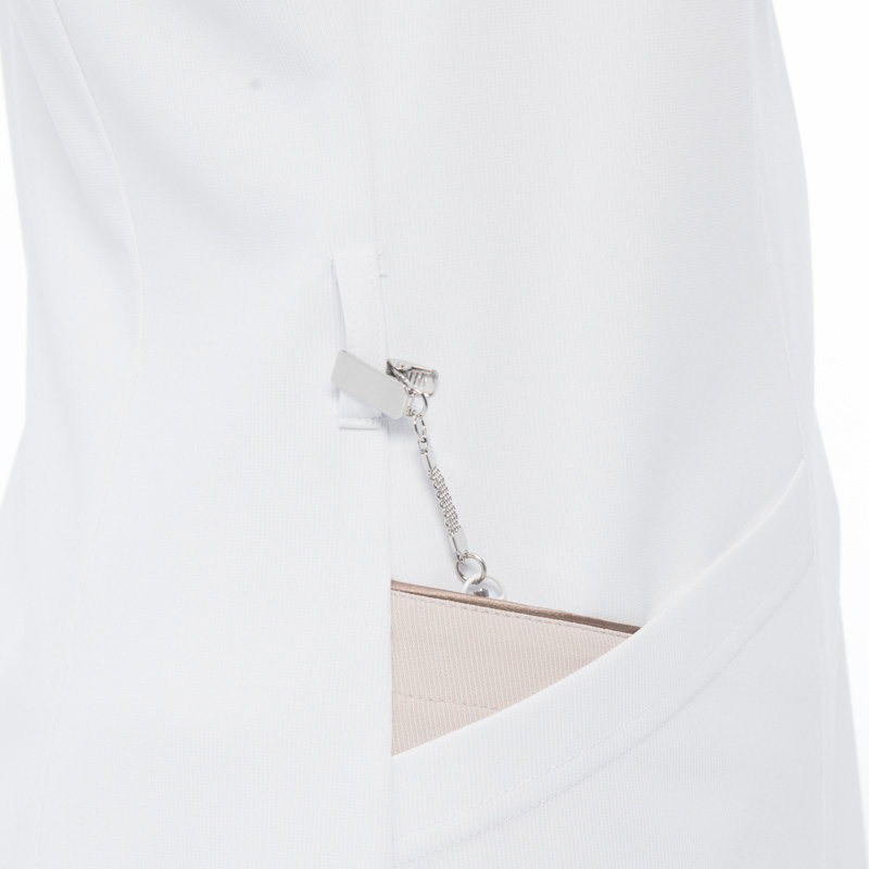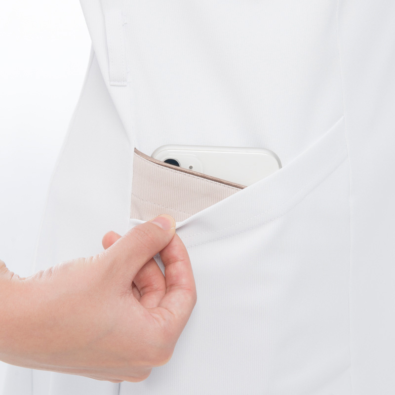 クラシカルで上品な雰囲気のスタンドデザイン。首から少し離れた位置に設定した衿が、首回りをすっきりときれいに見せてくれます。胸元の見えにくいスタンドカラーは、飛沫感染予防にも適しています。右腰のダブルポケットの内側はスマートフォンを収納できます。素材は涼感性、高ストレッチ性を持つ高機能ニットを使用しています。