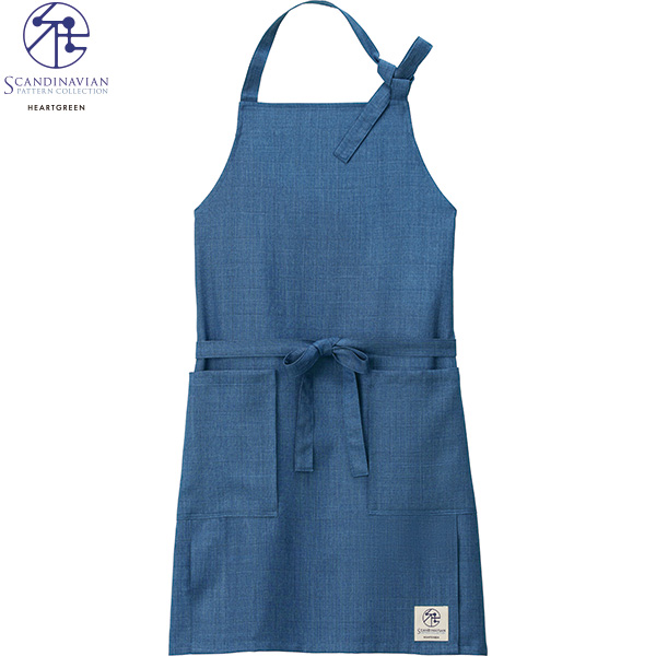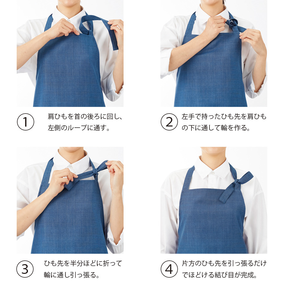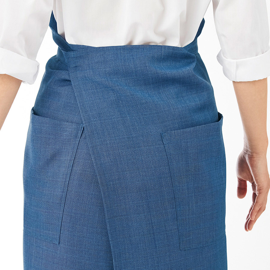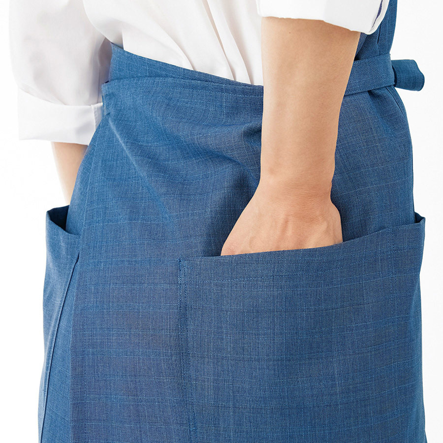 腰ひもを前で結ぶユニセックスなエプロンは、シャツと同じダンガリー調素材。