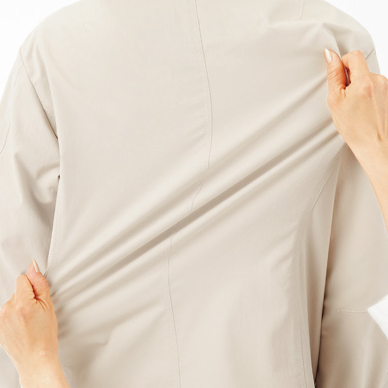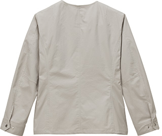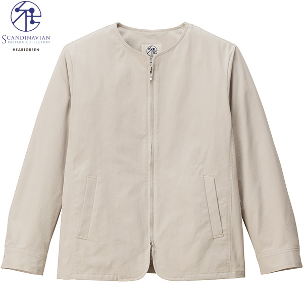 清潔感ただようシンプルデザインのワーク調ブルゾン。リラックス感のある綿タッチ&しわ加工が特徴のカジュアルブルゾンを、ミニマルなノーカラーデザインでスタイリッシュに仕上げています。綿のチノ素材にありがちなゴワゴワ感もなく、すっきりとした素材です。ハイストレッチと立体パターンにより、ケアワークのどんな姿勢や動きにも快適に対応します。印鑑やペンはもちろん、聴診器や体温計などの医療器具を、複数のポケットに収納できる、ナースの強い味方。
