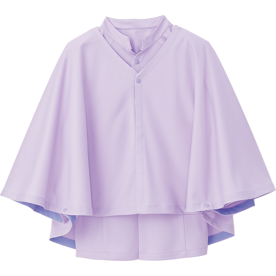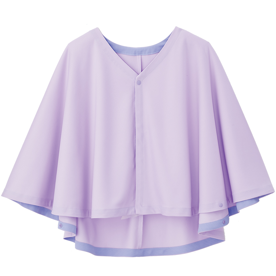 デザイン性のある立ち衿に加え、胸元も見えづらいデザイン。ボタンを留めることで袖口ができ、手さばきが楽に。ケープは、肩掛け・膝掛けとしても使用できる2way仕様。車イスで使用する際も巻き込みにくい設計。※ルームウェアとケープのセット商品です。単品での販売はしておりません。