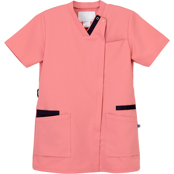 アシンメトリーな衿配色のシンプルな男女兼用スクラブ。左腰にペンなどを掛けられる3連ループや、底にマチを付け容量を大きくした両腰ポケットが機能性を高めています。
