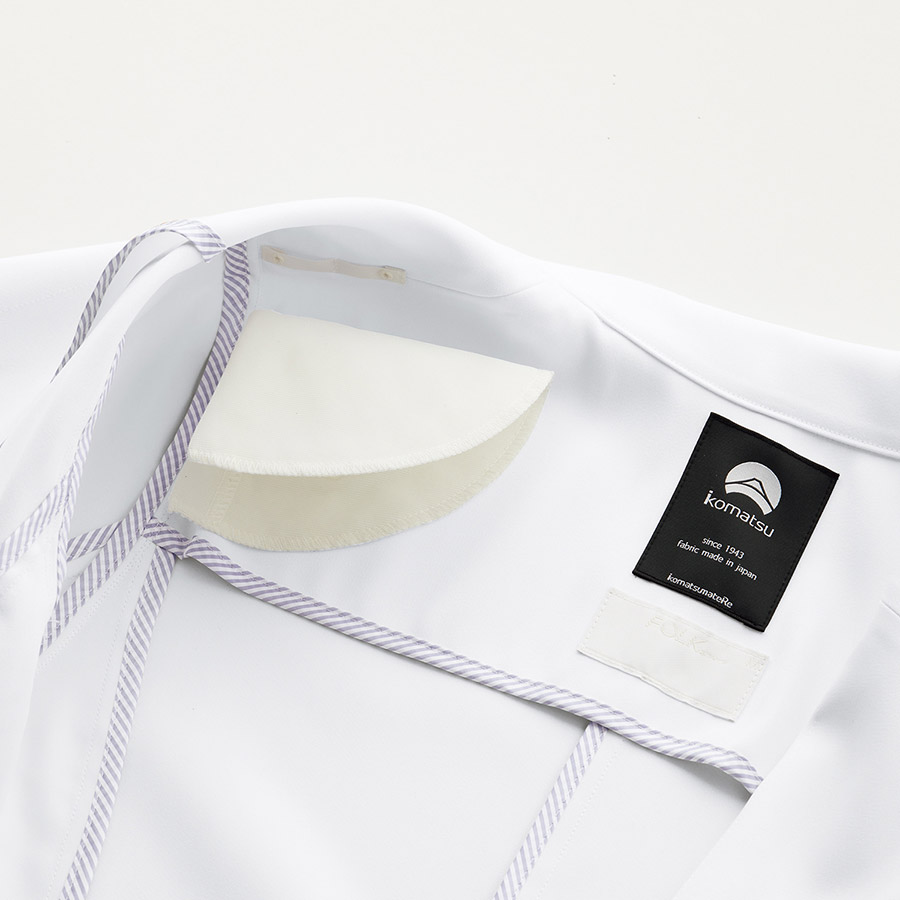 縦糸に中空糸を使用した超軽量でMADE IN JAPANの高級素材。表側はさらりとした肌離れの良い素材で、程よい張り感が特徴です。毎年モードの中心地であるパリにて、全世界のファッション業界に向け開催されるプルミエールヴィジョンに出展する、日本を代表する素材メーカー、小松マテーレと共同開発しました。「羽織る」という言葉がふさわしく、軽くしなやかな風合いをお楽しみいただけます。