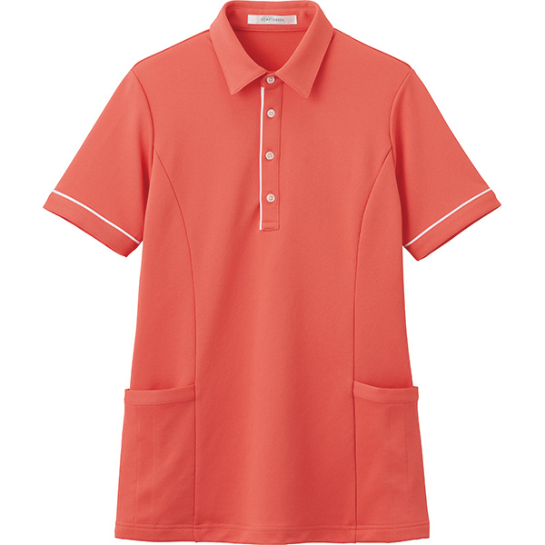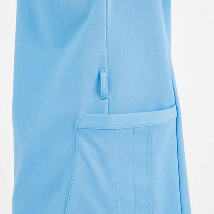 介護のプロらしいきちんと感を引き立てるロング丈。必要なものを収納できる大容量の腰ポケットつき。風も熱も通り抜ける鹿の子ニット素材なので、ロング丈でも涼しく着られます。