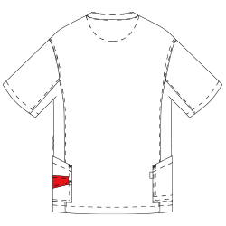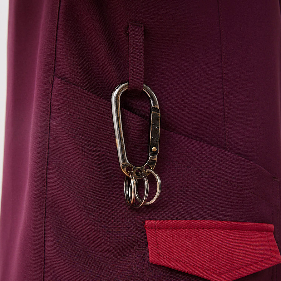 フロントスナップあき、両脇ポケット(左のみ2段ポケット)、脇ループ付き