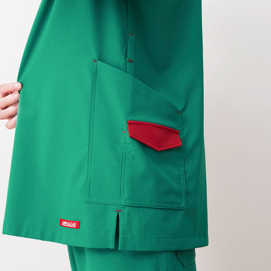 美しさと高機能を備えたスマート・スクラブスタンダードラインの基本的な性能に加え、さらに素材・機能・デザインにもこだわった「アニマリード」のハイライン。使用する素材「リップストップ」は丈夫でありながらも、爽やかな着心地。格子状の織り柄は上質さも感じさせる、高機能と美しさを兼ね備えた1枚です。