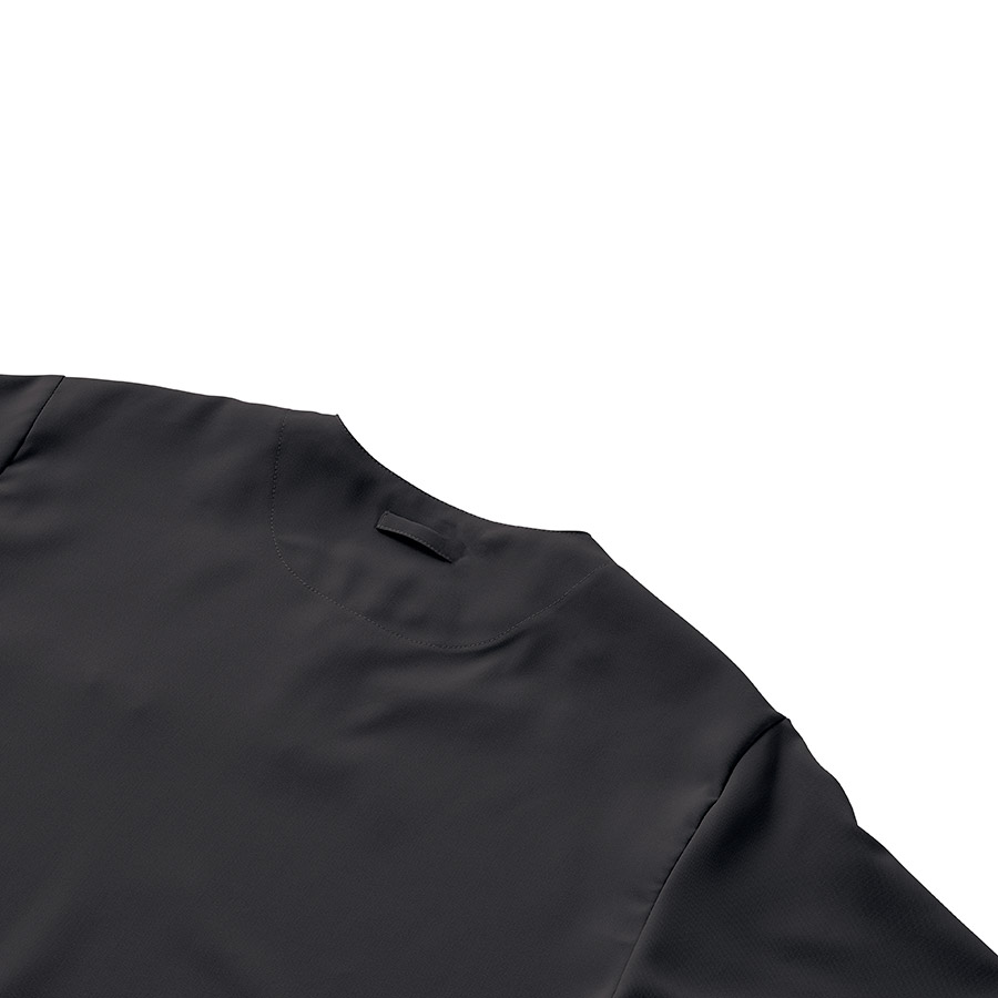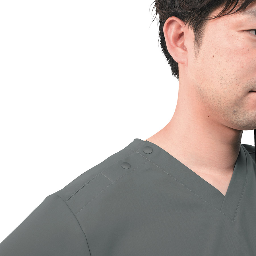 かぶりタイプ(肩口スナップあき)、ネームループ、ハンガーループ、両脇ポケット、両脇スリット、脇下消臭テープ付き