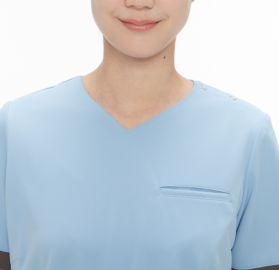 袖口の配色パーツがアイキャッチになるレディススクラブ。