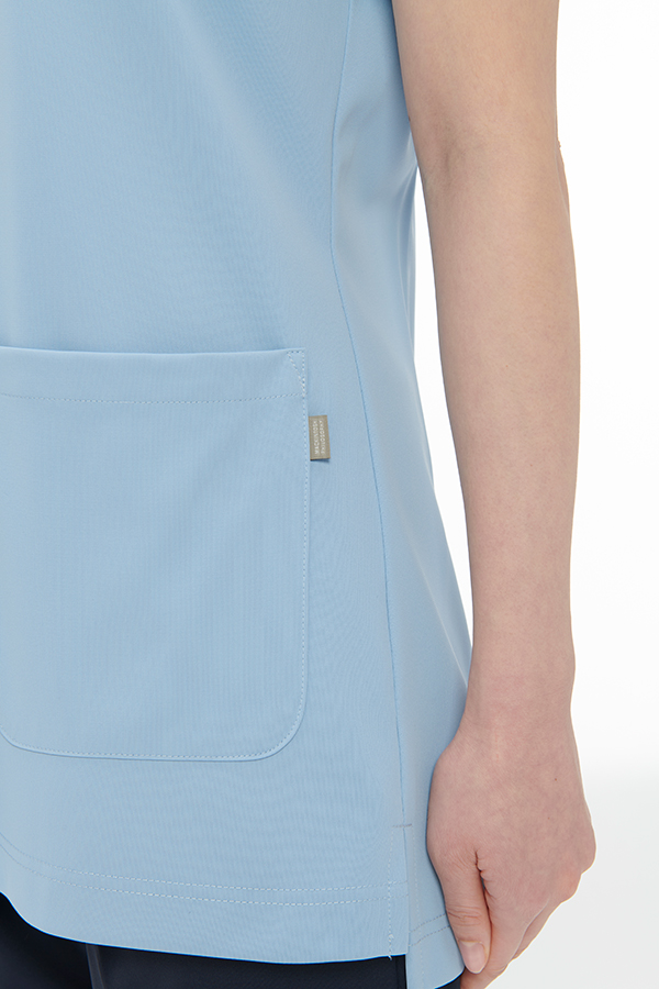 袖口の配色パーツがアイキャッチになるレディススクラブ。シンプルな中にポケットの形状や優しい雰囲気のネックラインなどこだわりが凝縮されています。高機能ニット素材を使用していますので着心地も快適です。▼▽▼ 商品の詳細情報はナガイレーベン公式サイトよりご覧いただけます ▼▽▼