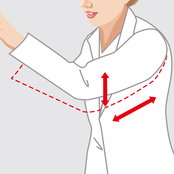 軽いストレッチ性をもつ綿混紡の素材を用い、診察時の腕の動きをさまたげない、特別な袖の立体パターンを採用しました。