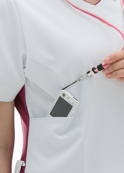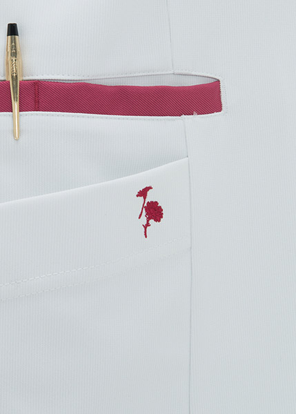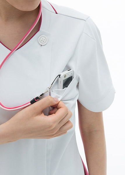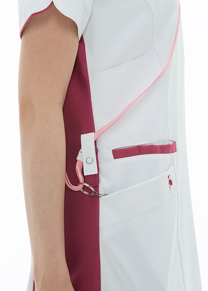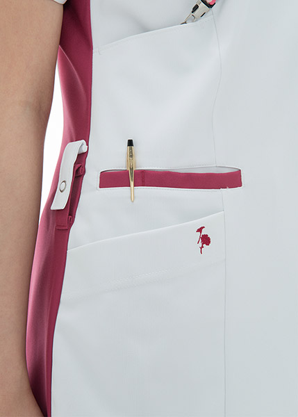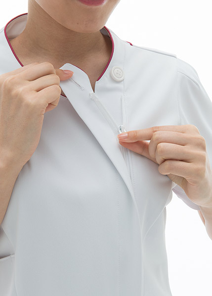 色ごとに違う幸せを予感させるモチーフがポケット口に刺繍されています。やさしいイメージの襟元と袖口のデザインが患者さんに癒しを与えます。右脇のダブルループが機能的。涼感素材を使用した、着用しやすいファスナー開きの白衣です。