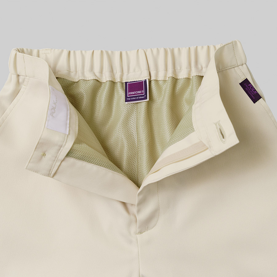 パントーンカラーに新色としてコスメティックカラーが新登場。女性を意識したしたテーパードの新シルエット。ウエスト回りと太もも周りに、「ゆるみ」を持たせた、テーパードを採用し、屈伸運動や前屈動作を繰り返し、女性陣の意見交換して完成しました。