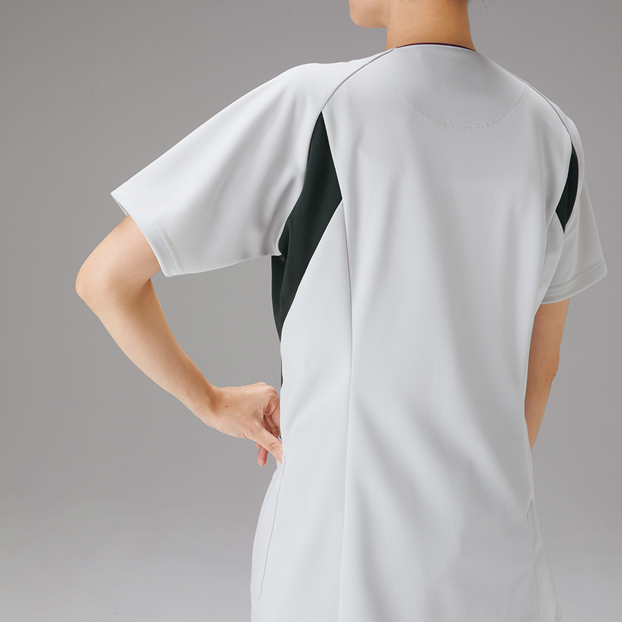 袖と背面を着心地の良いニット素材で。ボディラインをすっきりと見せる切り替え胸元が見えにくい襟ぐりなど、女性に嬉しいデザイン