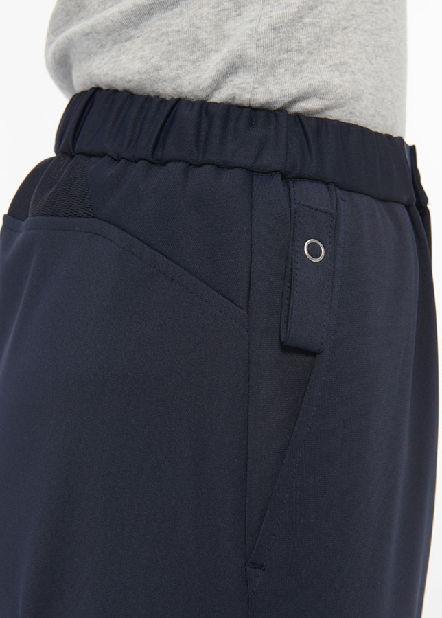 伸縮性に優れたしなやかなニット素材を使用し、被服圧を軽減するパターン設計・仕様にすることによって太ももから膝にかけてのツッパリ感が解消され脚を広げたり曲げたりする動作時のストレスを解消してくれます。さらに後ろウエスト部分にメッシュを使用することによって、しゃがんだ際もウエストがずり落ちにくくなっています。鍵などをかけてポケットに収納可能なループ付き。通気性と接触冷感のある高機能素材を使用した男女兼用パンツです