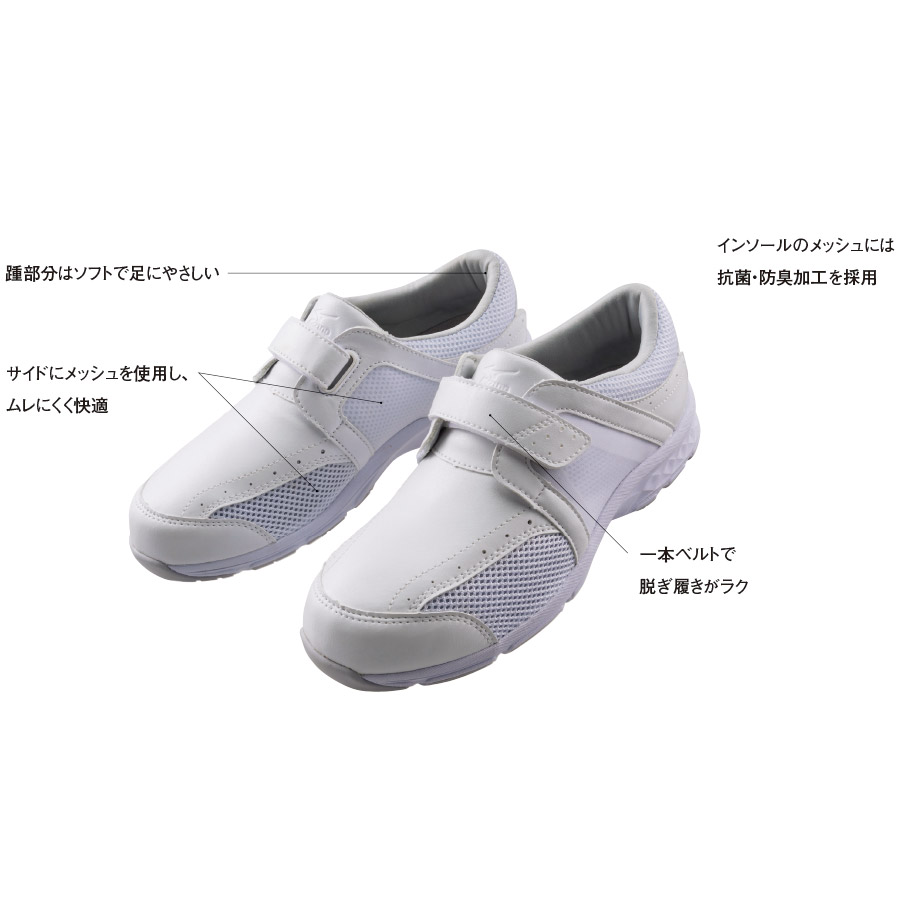 忙しい現場に最適な、軽くて脱ぎ履きしやすいシューズです。幅も広く、履いていてストレスを感じにくいです。インソールのメッシュには抗菌・防臭加工を施しており、通気穴やサイドのメッシュなどでにおいやムレにも考慮しています。