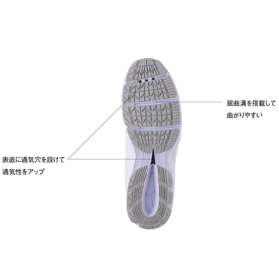 インソールのメッシュには抗菌・防臭加工を施しており、通気穴やサイドのメッシュなどでにおいやムレにも考慮しています。