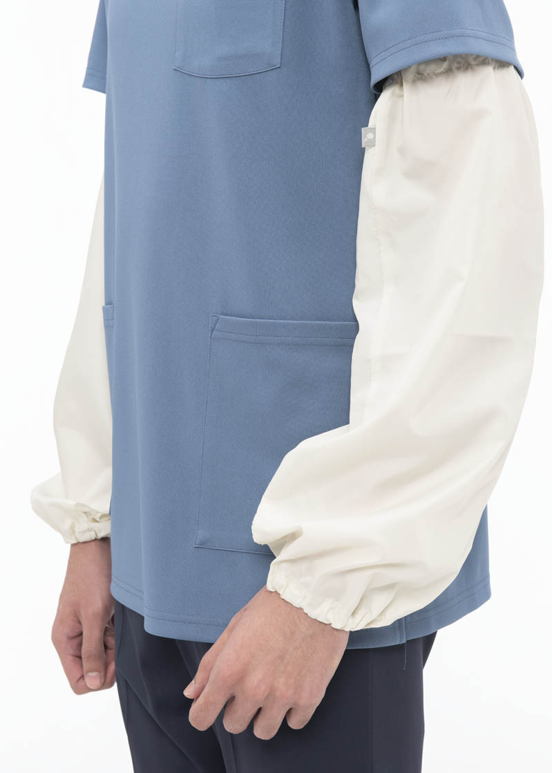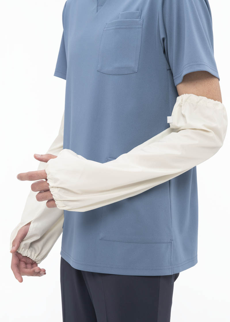 腕部分への飛沫を防ぐアームカバー。先端部分の開き部分に親指を通していただくと甲の部分もカバーできます。軽量で撥水処理をした素材を使用し、繰り返し洗濯して清潔に使用できる環境にも優しいアイテムです。▼▽▼ 商品の詳細情報はナガイレーベン公式サイトよりご覧いただけます ▼▽▼