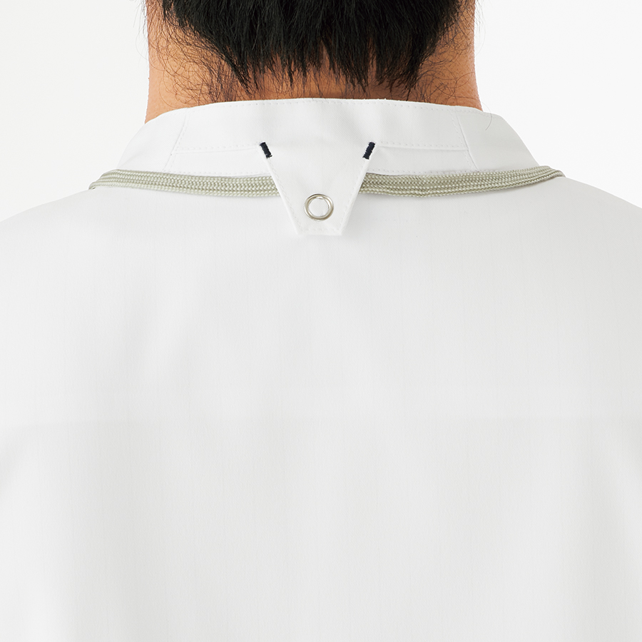 スマートな雰囲気とクールな印象を兼ね備えたアシンメトリーな配色を魅せるデザイン。柔らかなカーブを描く衿元で、ジェンダーレスな印象に。