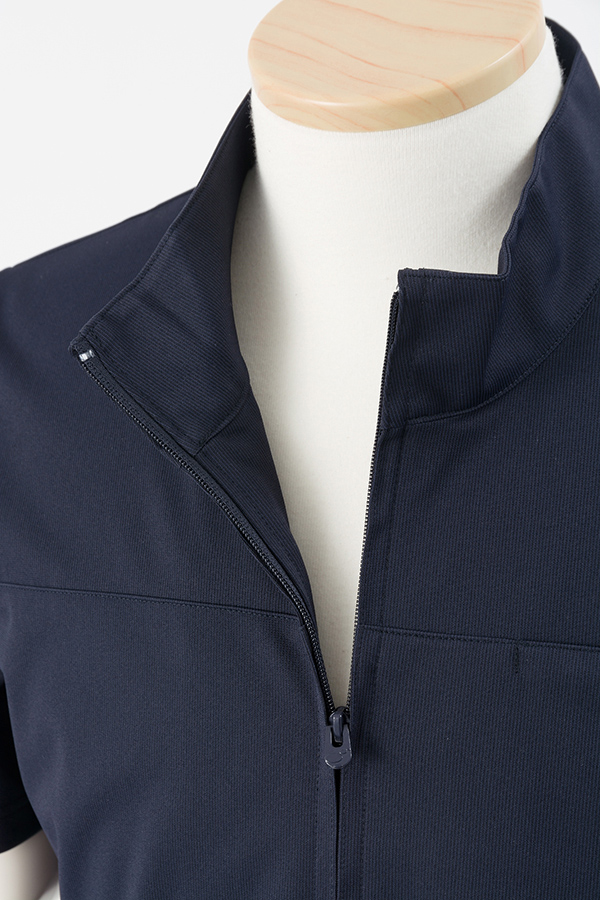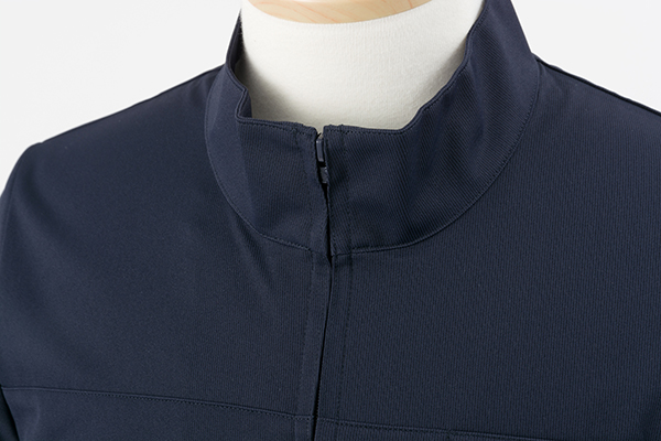 センターファスナー開きのジャケットです。落ち着いたカラーとシャープなデザインが信頼感を感じさせます。