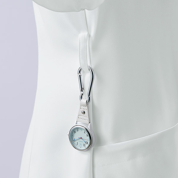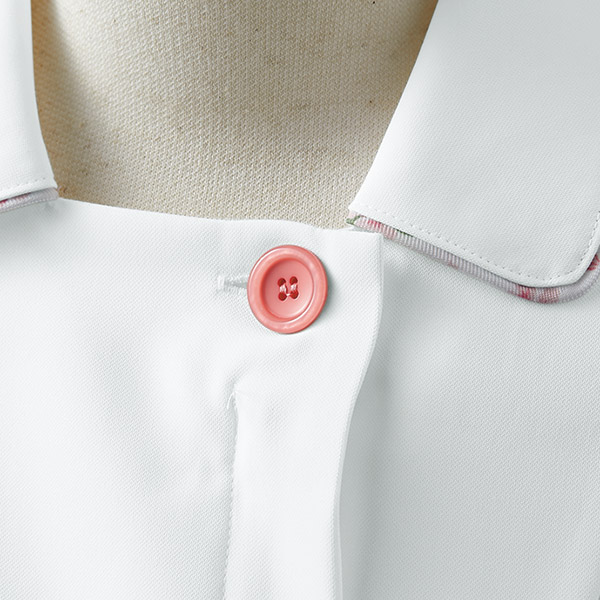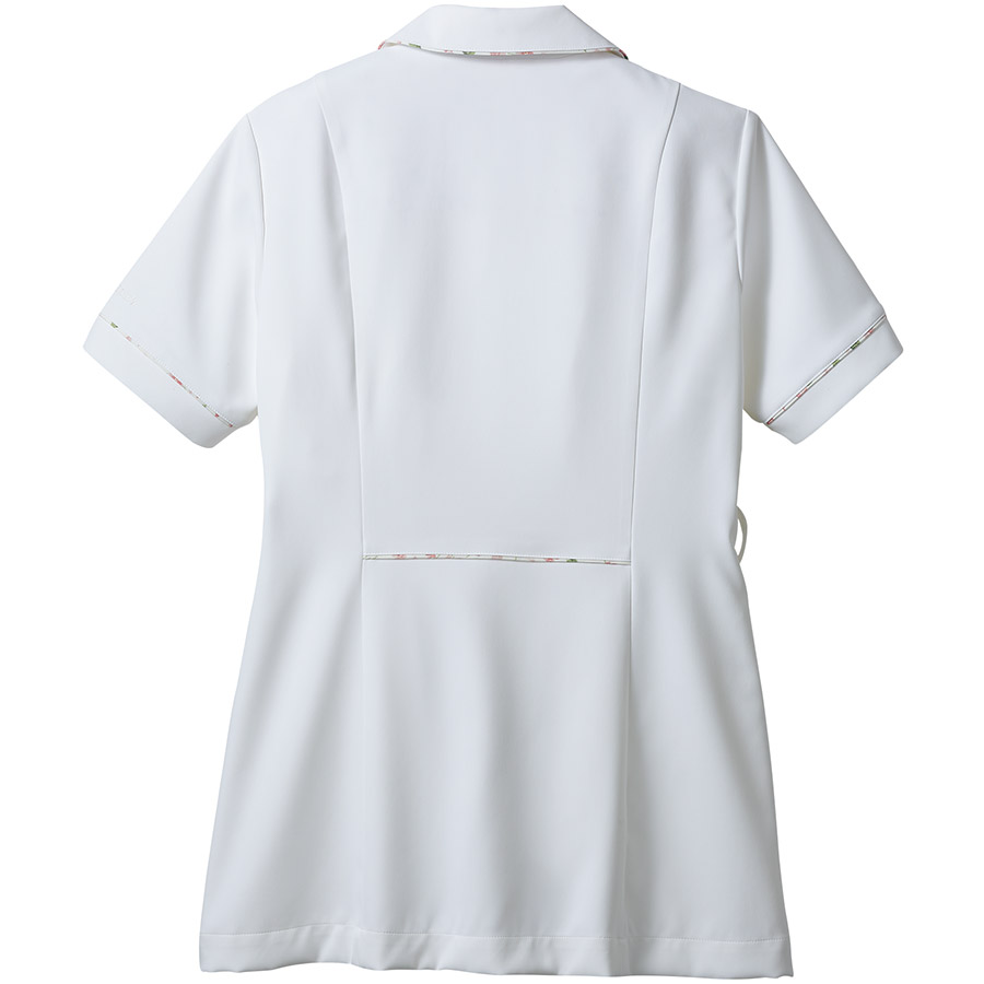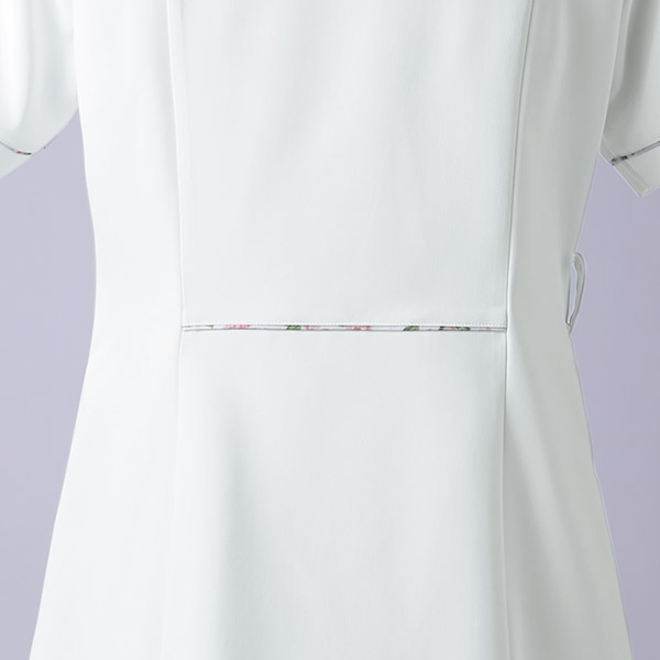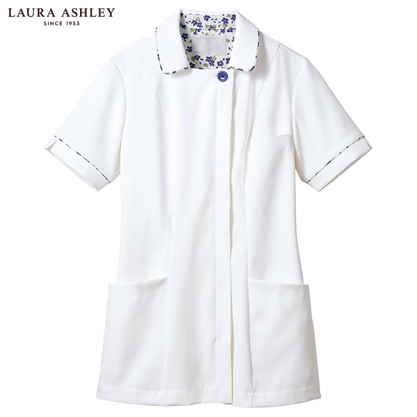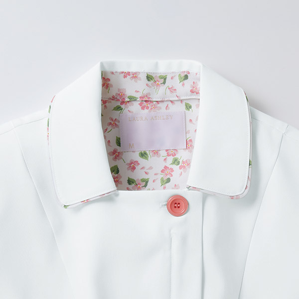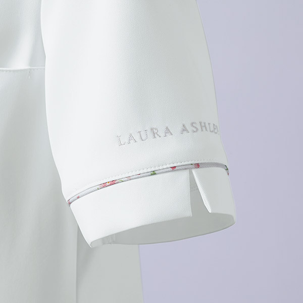 コンパクトな襟にパイピングの彩りをあしらって、凛とした印象に。体のカーブに自然に寄り添うシルエットがきれいなラインを演出。透けにくい素材だから、安心して着られます。背裏や袖口部分に花柄生地をアクセントとして使用。時計などがかけられる便利なウエストループ付き。生地機能は制菌・吸汗・制電・防汚機能付きです。ローラ アシュレイの優雅なプリント生地を使った、洗練のコレクション。女性らしさを意識したシルエットで、着映えにもこだわりました。介護や医療の現場に、華やぎとやすらかぎを添えてくれます。