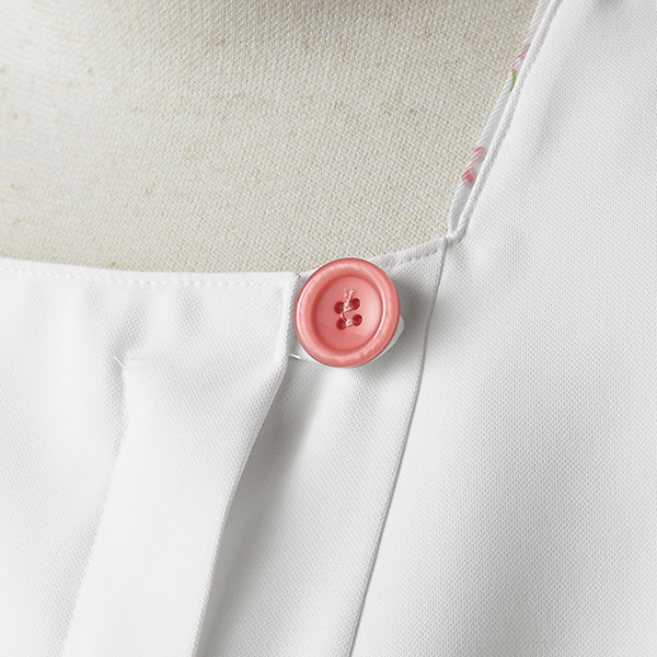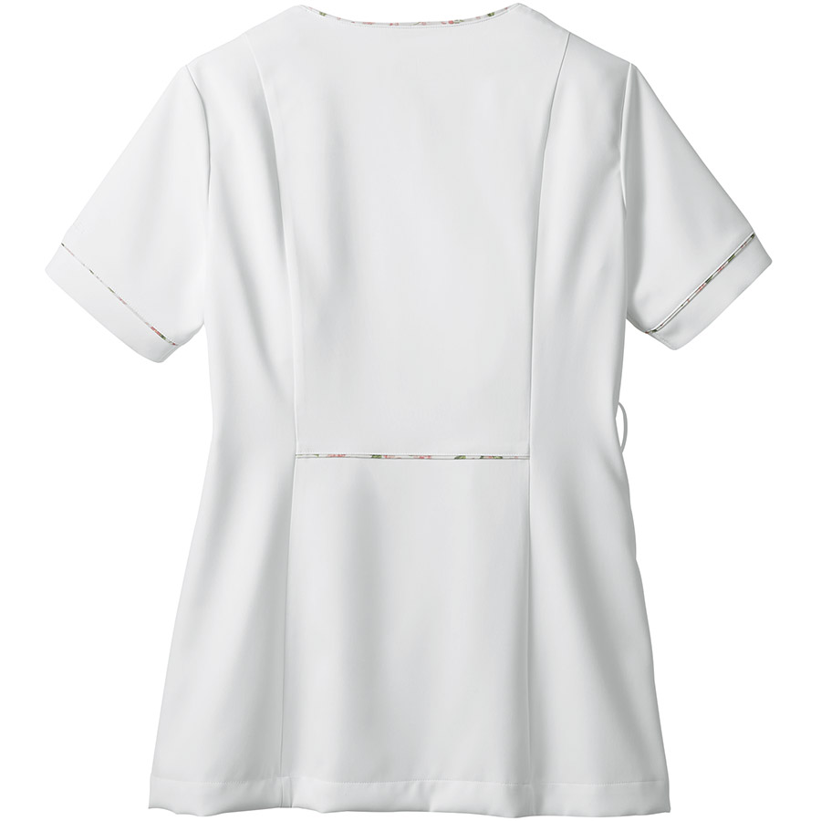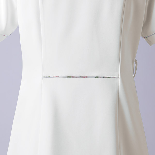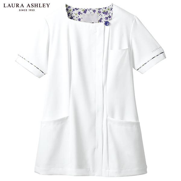 デコルテラインがきれいに見えるスクエアネックで、すっきり華奢な印象。ウエストをさりげなく絞ったフェミニンなシルエットもポイント。透けにくい素材だから、安心して着られます。背裏や袖口部分に花柄生地をアクセントとして使用。時計などがかけられる便利なウエストループ付き。生地機能は制菌・吸汗・制電・防汚機能付きです。ローラ アシュレイの優雅なプリント生地を使った、洗練のコレクション。女性らしさを意識したシルエットで、着映えにもこだわりました。介護や医療の現場に、華やぎとやすらかぎを添えてくれます。