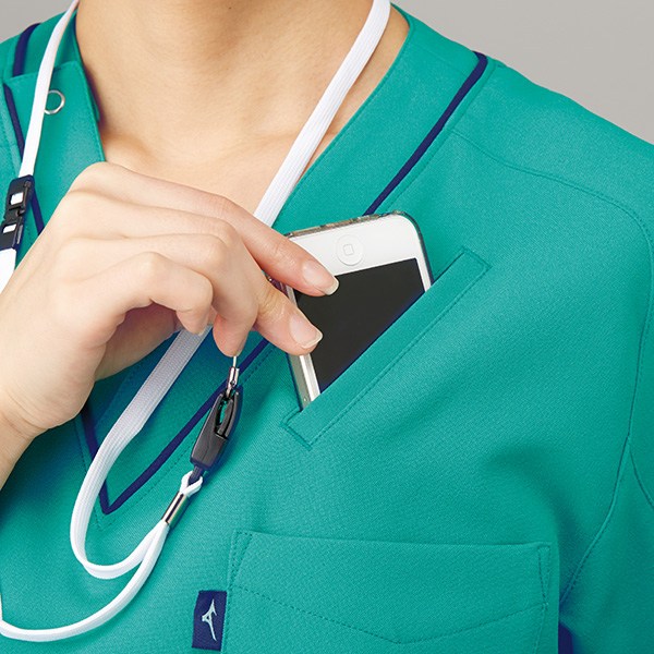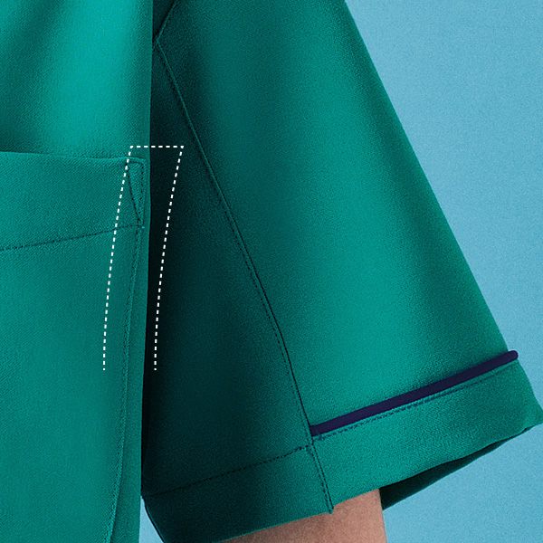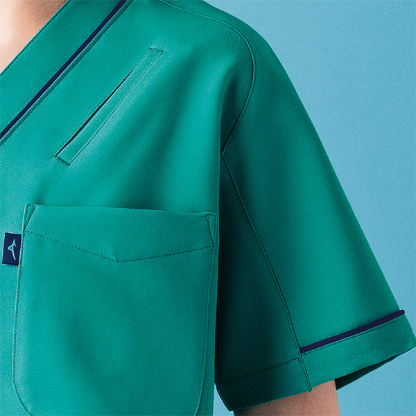 襟元と袖に配置されたパイピングで、スタイリッシュに。スクラブでつながる、キモチがある。