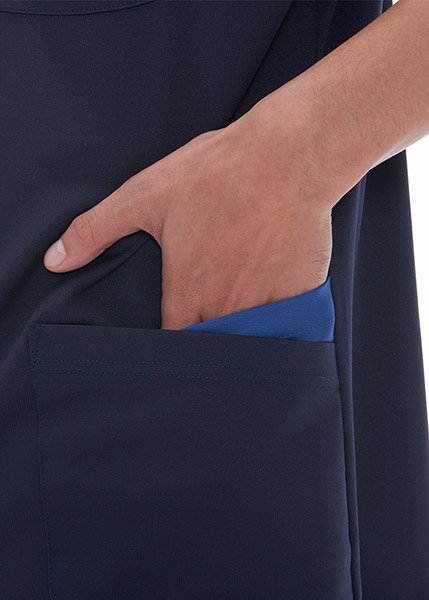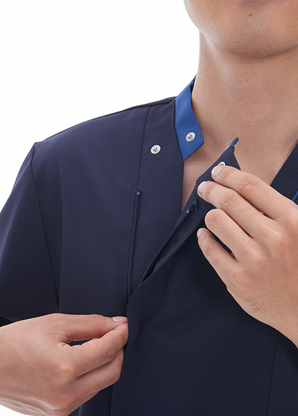 フロントファスナー開きの男性専用スクラブです。涼感素材のニットが快適な着心地を提供します。アシンメトリーの衿元が自由さを感じさせます。背中部分の紋章織ネームもデザインポイントになっています。