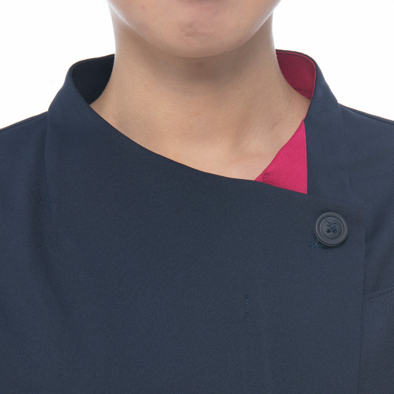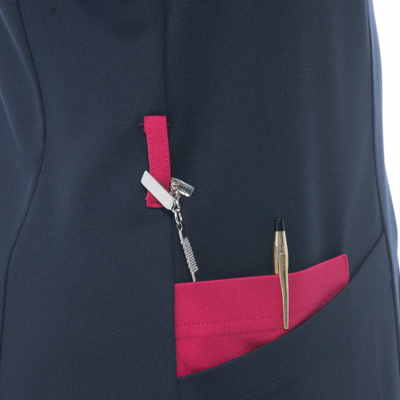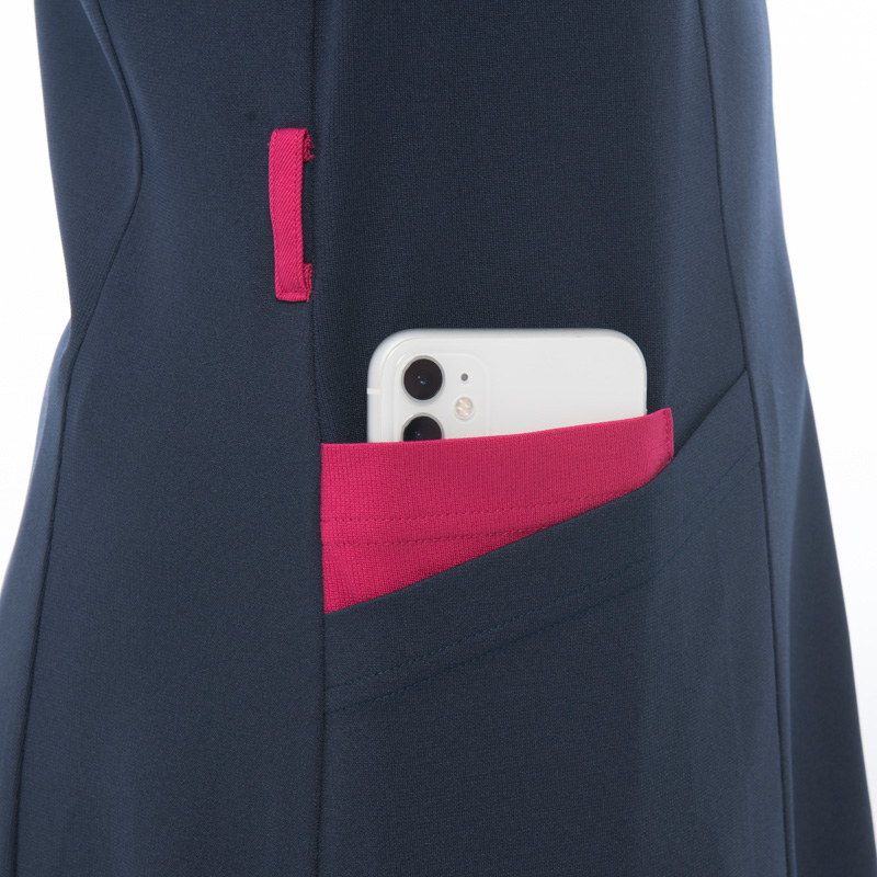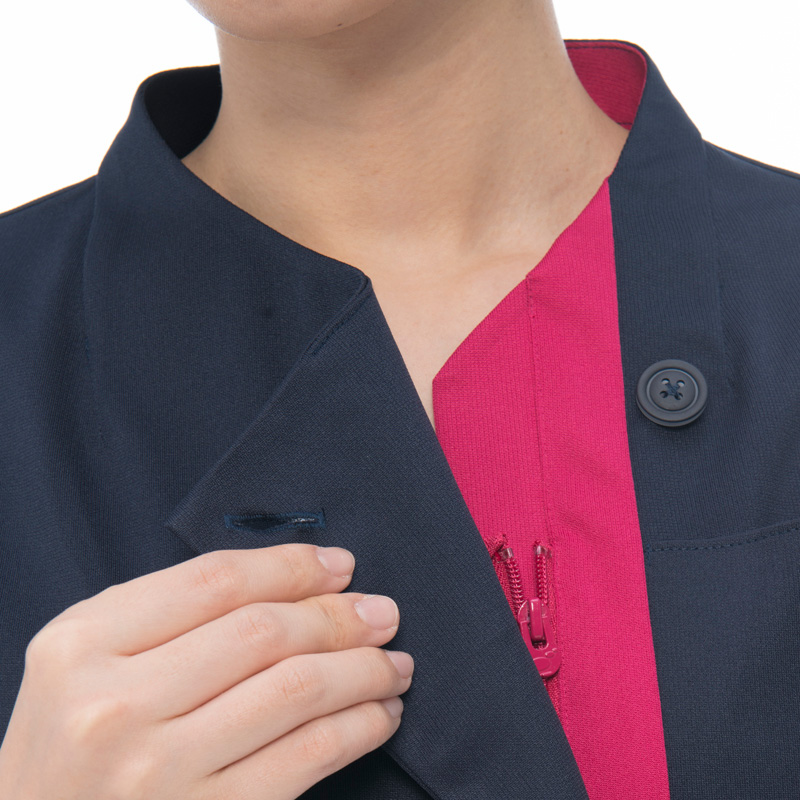 身頃から続け断ちの後ろハイネックや、アシンメトリー切り替えの配色がスタイリッシュなカラースクラブ。飛沫感染予防の為に、衿ぐりの開きを浅くして肌の露出を控えました。前ファスナーで羽織って着ることが出来る為、着脱が簡単です。右腰のダブルポケットの内側はスマートフォンを収納できます。素材は涼感性、高ストレッチ性を持つ高機能ニットを使用しています。▼▽▼ 商品の詳細情報はナガイレーベン公式サイトよりご覧いただけます ▼▽▼
